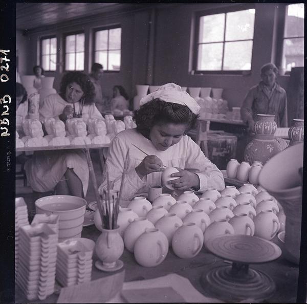 [Etapa de producción; niñas encargadas de la decoración de objetos de cerámica. Fábrica de Cerámica de Lota, sección decorado] [fotografía] Ignacio Hochhäusler.