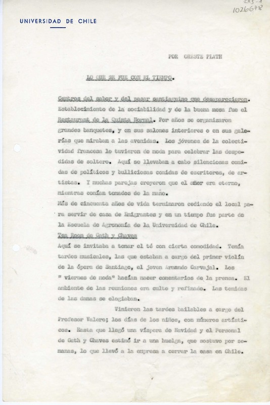 Lo que se fue con el tiempo [manuscrito] Oreste Plath.