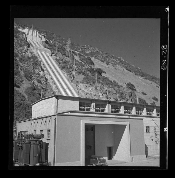 Casa de máquinas desde cámara de carga con la tubería en primer plano [fotografía] Luis Ladrón de Guevara.