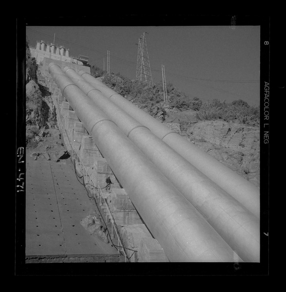 [Vista de cañerías metálicas, conducen el agua de la cámara de carga a la casa de máquinas, descenso casi vertical de 120 m.] [fotografía] Luis Ladrón de Guevara.