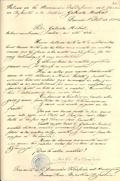 [Carta] 1945, Buenos Aires [a] Gabriela Mistral [manuscrito] Asociación Pro Difusión del Jardín de Infantes.