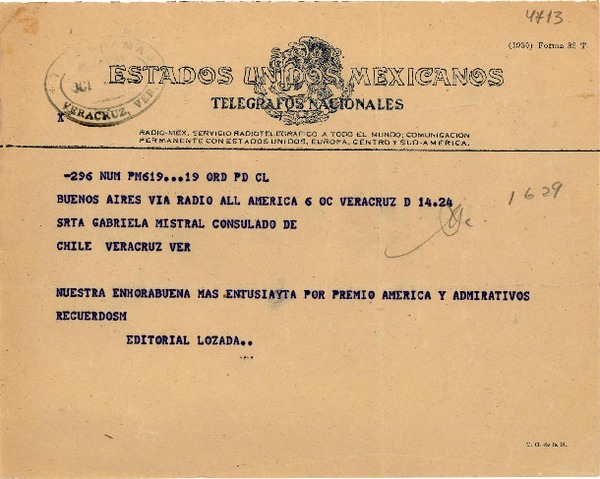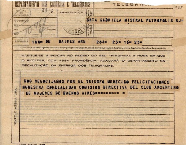 Telegrama 1945 [nov. a] Gabriela Mistral, Petrópolis, R.J. [manuscrito] Comisión Directiva del Club Argentino de Mujeres de Buenos Aires.