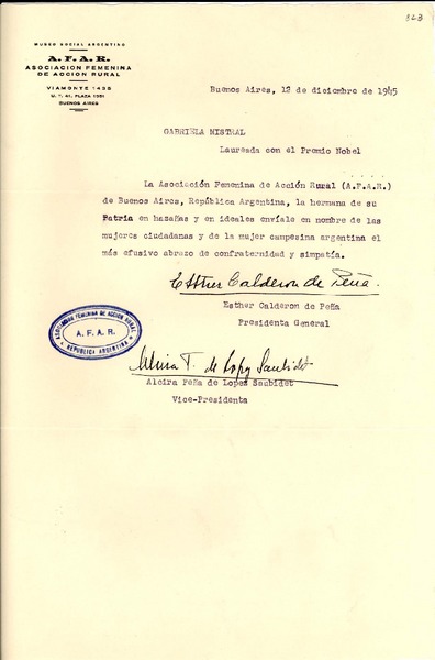[Carta] 1945 dic. 12, Buenos Aires, Argentina [a] Gabriela Mistral [manuscrito] Asociación Femenina de Acción Rural (A.F.A.R.)