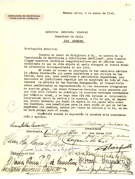 [Carta] 1946 mar. 4, Buenos Aires, [Argentina a] Gabriela Mistral, Consulado de Chile, Los Angeles, [EE.UU.] [manuscrito] Asociación de Escritoras y Publicistas Católicas.