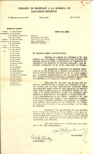 [Carta] 1947 ene., Buenos Aires, [Argentina] [a] Gabriela Mistral, Embajada de Chile, Los Angeles, Estados Unidos [manuscrito] Comisión de Homenaje a la Memoria de Salomon Resnick.