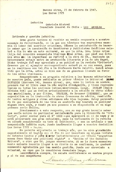 [Carta] 1947 feb. 23, Buenos Aires, [Argentina a] Gabriela Mistral, Consulado General de Chile, Los Angeles, [EE.UU.] [manuscrito] Asociación de Escritoras y Publicistas Católicas de la Argentina.