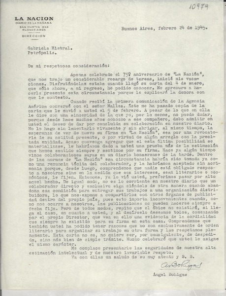 [Carta] 1945 feb. 24, Buenos Aires, [Argentina] [a] Gabriela Mistral, Petrópolis, [Brasil] [manuscrito] Ángel Bohigas.