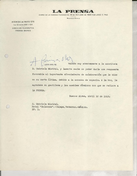 [Carta] 1949 abr. 12, Buenos Aires, [Argentina] [a] Gabriela Mistral, Hotel "Salmones", Jalapa, Veracruz, México [manuscrito] Alberto Gainza Paz.
