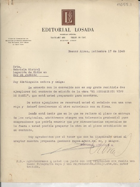 [Carta] 1940 sept. 17, Buenos Aires, [Argentina] [a] Gabriela Mistral, Legación de Chile, Rio de Janeiro, [Brasil] [manuscrito] Editoral Losada.