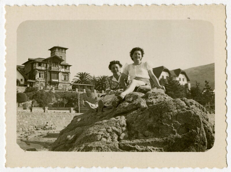[Mujeres sobre roca en balneario de Papudo] [fotografía].