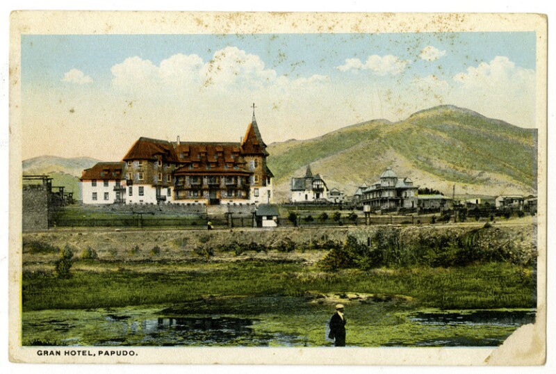 Gran Hotel, Papudo. [Vista del Gran Hotel, al fondo, la casa de Julio Zamora Larraín, otrora edificada como el pabellón de la Compañía de Cervecerías Unidas de Llimache, en la Exposición del Centenario en la Quinta Normal (demolida en la década del 90)] [fotografía] Juan Brito Gaete.