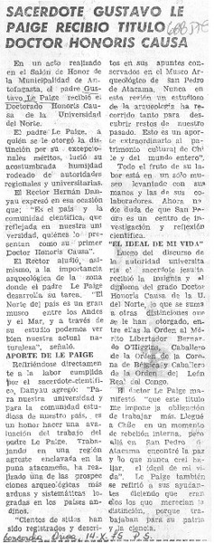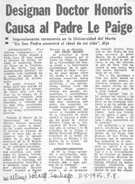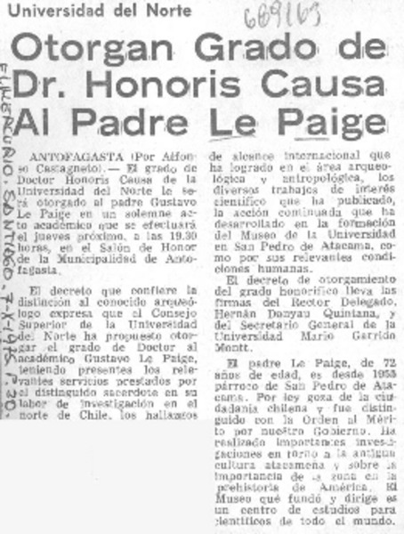 Otorgan grado de Dr. Honoris causa al padre Le Paige. [artículo]