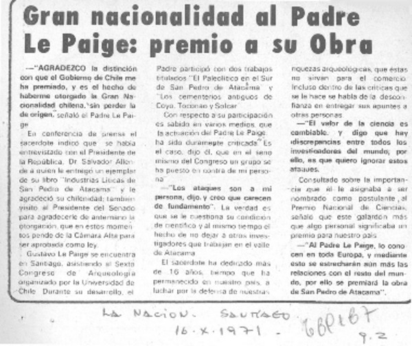 La Gran nacionalidad para el Padre Gustavo Le Paige. [artículo]