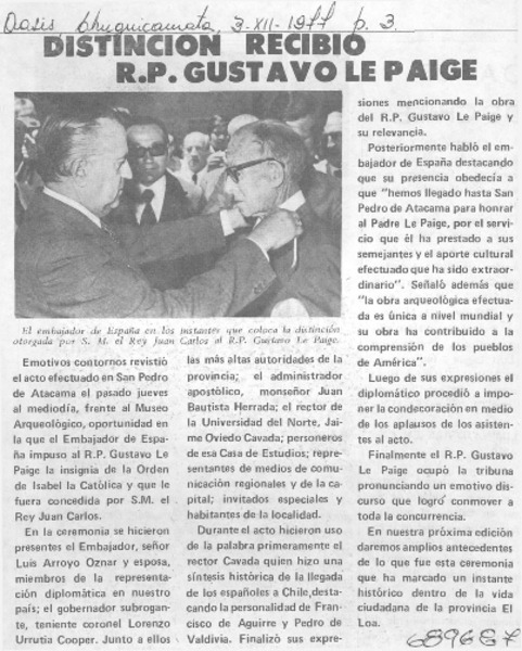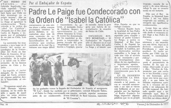 Embajador de España condecora hoy al padre Gustavo Le Paige. [artículo]