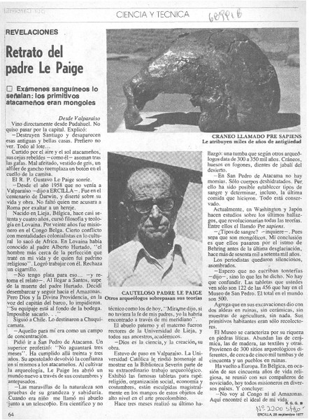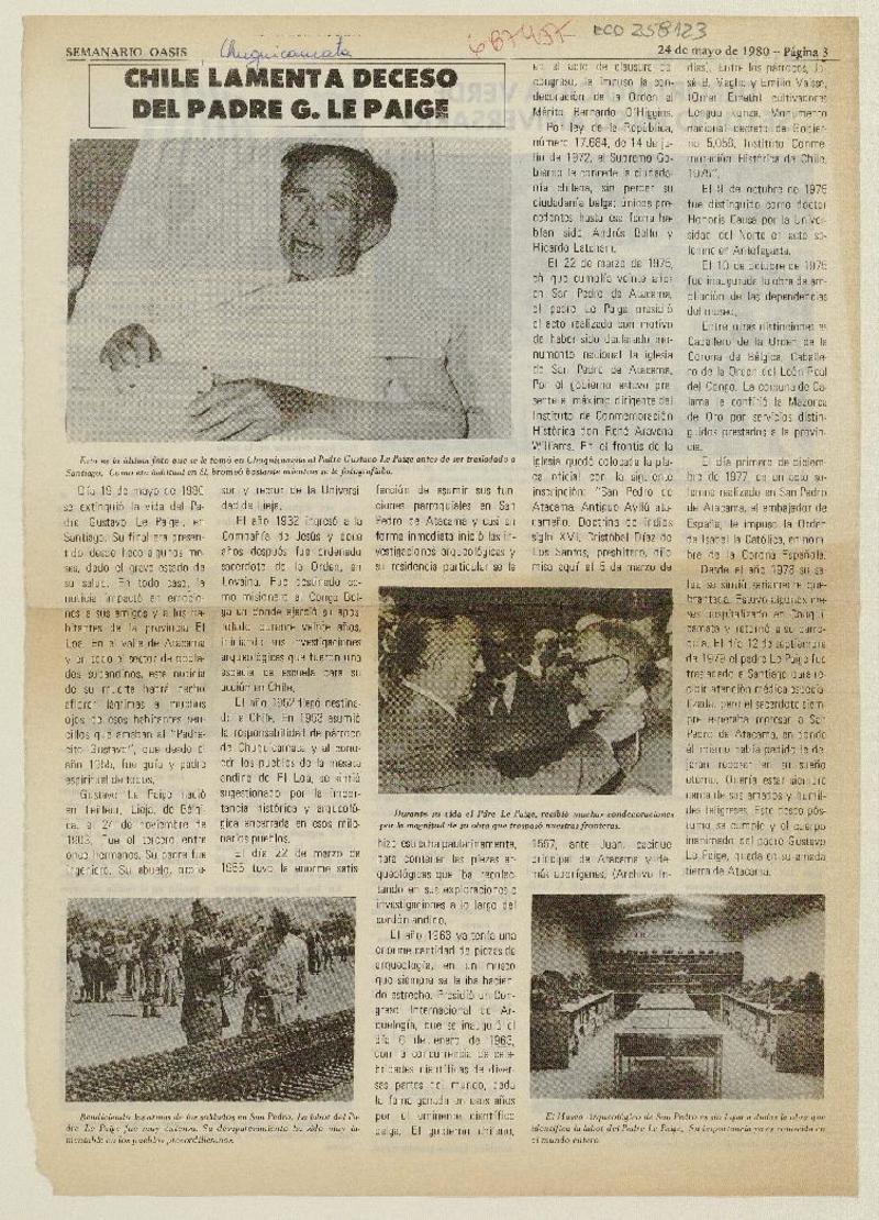 Chile lamenta deceso del padre G. Le Paige. [artículo]