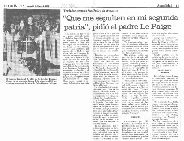 Padre Le Paige sepultado en la tumba que él cavó [artículo] Arturo Larraín Avalos.