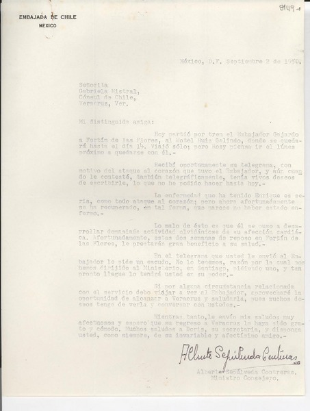 [Carta] 1950 sept. 2, México D. F., [México] [a] Gabriela Mistral, Veracruz, [México] [manuscrito] Alberto Sepúlveda Contreras.