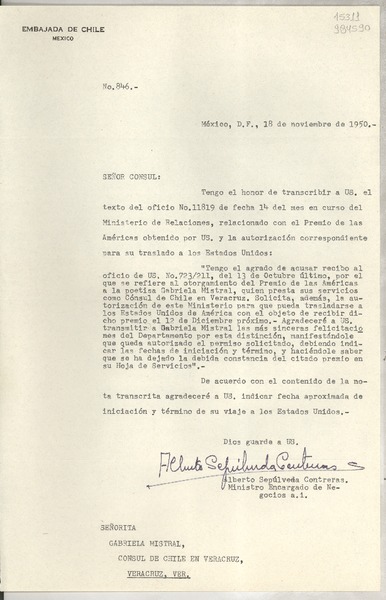 [Oficio] N° 846, 1950 nov. 18, México D. F. [a] Gabriela Mistral, Cónsul de Chile, Veracruz [manuscrito] Alberto Sepúlveda Contreras.