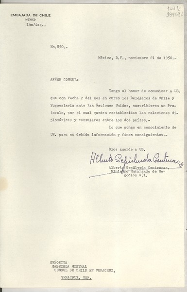 [Oficio] N° 850, 1950 nov. 21, México D. F. [a] Gabriela Mistral, Cónsul de Chile, Veracruz [manuscrito] Alberto Sepúlveda Contreras.