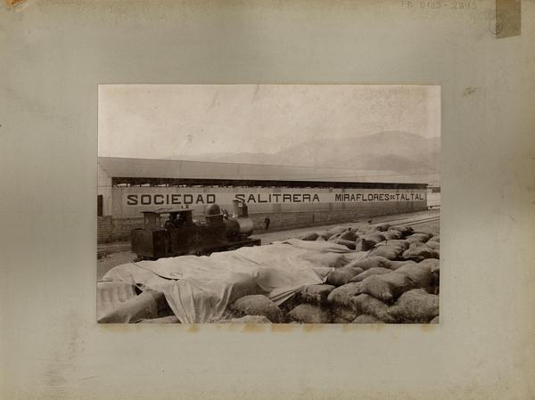 [Edificio de la Sociedad Salitrera Miraflores de Taltal, locomotora y salitre envasado en sacos] [fotografía].