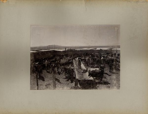 [Trabajadores de una salitrera y ganado vacuno destinado al consumo] [fotografía].