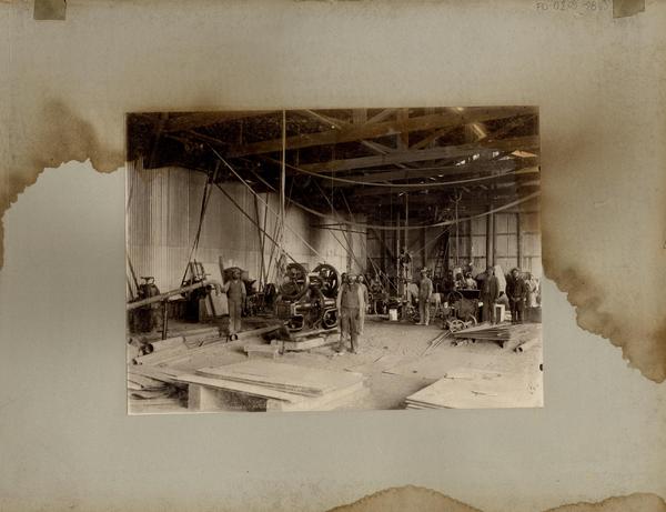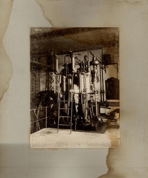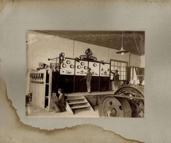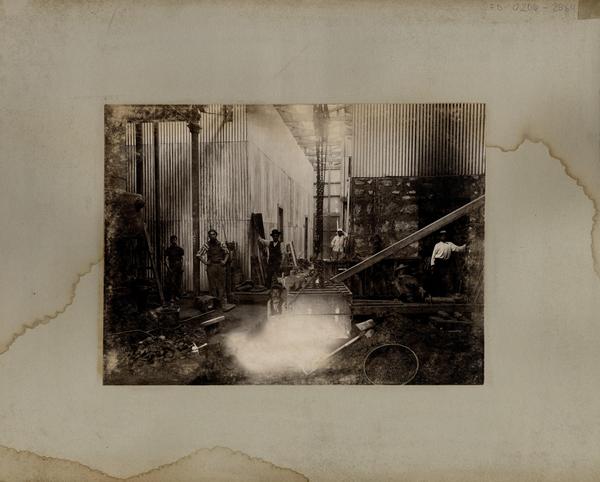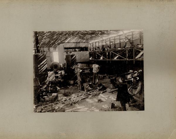 [Oficina salitrera: Obreros en sus faenas, en las instalaciones de maquinaria] [fotografía].