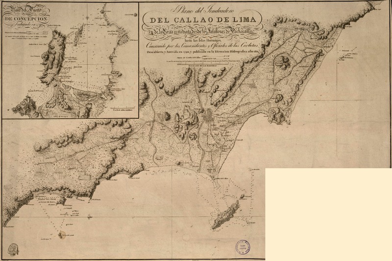 Plano del fondeadero del Callao de Lima y de la costa inmediata, desde los farellones de Pachacamac hasta las Islas Hormigas [material cartográfico] construido por los Comandantes y Oficiales de las Corbetas. Descubierta y Atrevída en 1790 y publicado en la Dirección Hidrográfica año 1811.