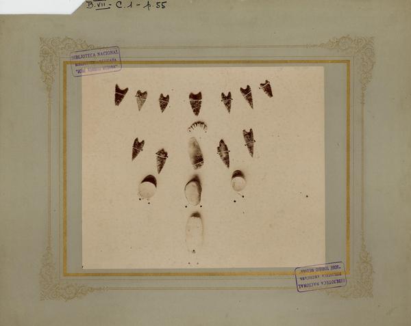 Excavaciones [arqueológicas] en la Hacienda de Cauquenes : puntas de flechas de oxidiana, cuchillo de sílex y objetos de cuarzo del hombre prehistórico de Chile [fotografía].