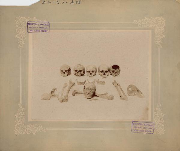 Excavaciones [arqueológicas] en la Hacienda de Cauquenes : cráneos de los habitantes prehistóricos de Chile [fotografía].