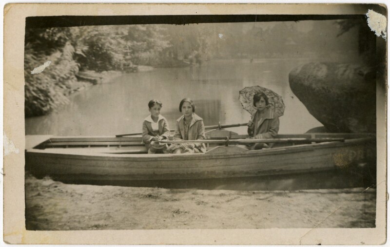 [Joven y niños al interior de un bote en la laguna de la Quinta Normal] [fotografía].