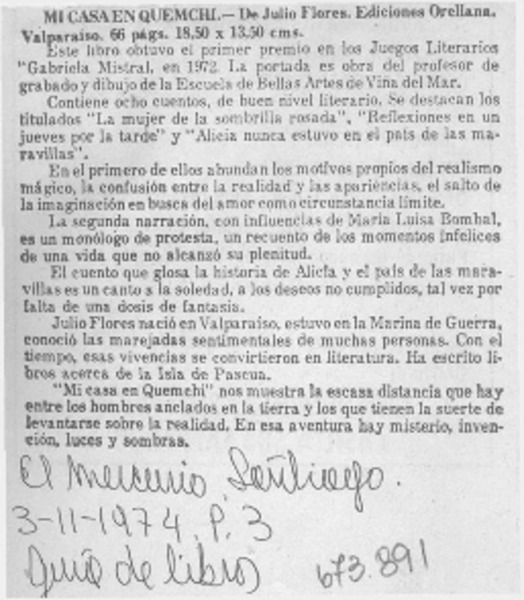 Autores chilenos - Mi casa en Quemchi - Flores, Julio