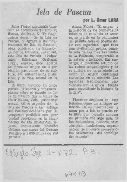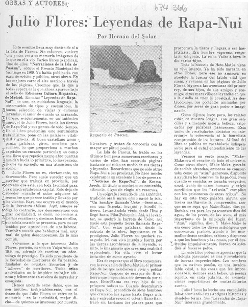 Julio Flores, Leyendas de Rapa-Nui [artículo] Hernán del Solar.