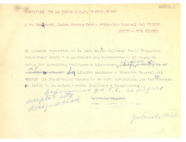 [Carta] 1951 oct. 10, París, [Francia] [a la] Sra. Doña Gabriela Mistral, Salita Sendillo, 17, Capodimonte, Napoli, [Italia] [manuscrito] Jaime Torres Bodet, Director General.
