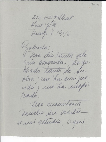 [Carta] 1946 mayo 8, New York, [EE.UU.] [a] Gabriela [Mistral] [manuscrito] Marina Núñez del Prado.