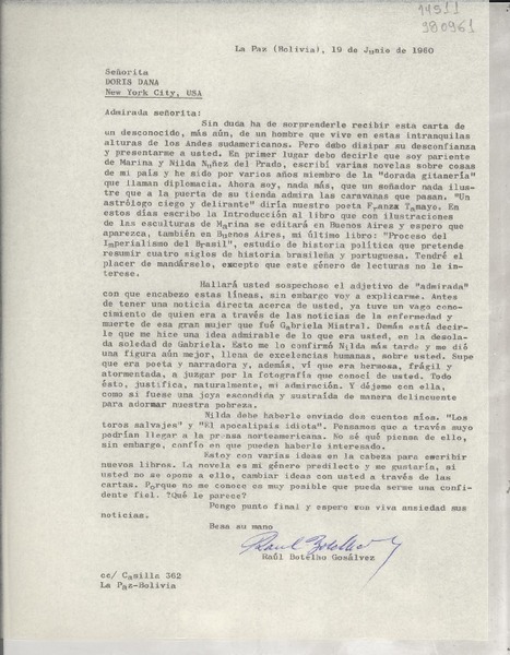[Carta] 1960 jun. 19, La Paz, Bolivia [a] Señorita Doris Dana, New York City, USA [manuscrito] Raúl Botelho Gosálvez.