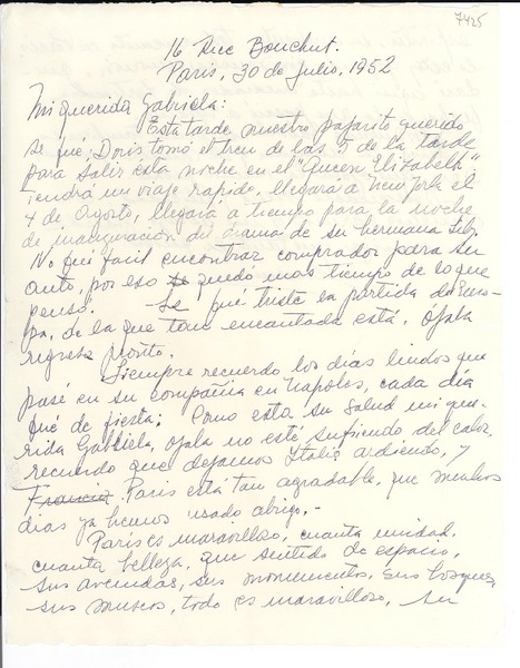 [Carta] 1952 jul. 30, París, [Francia] [a] Gabriela [Mistral] [manuscrito] Marina [Núñez del Prado].