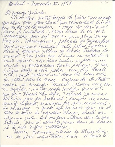[Carta] 1952 nov. 20, Madrid, [España] [a] Gabriela [Mistral] [manuscrito] Marina [Núñez del Prado].