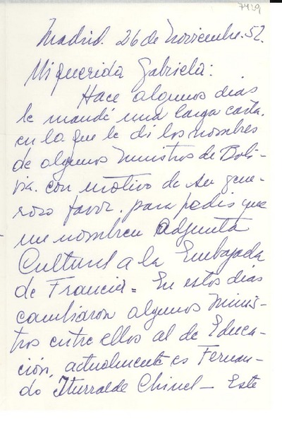 [Carta] 1952 nov. 26, Madrid, [España] [a] Gabriela [Mistral] [manuscrito] Marina [Núñez del Prado].