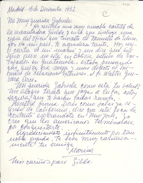 [Carta] 1952 dic. 15, Madrid, [España] [a] Gabriela [Mistral] [manuscrito] Marina [Núñez del Prado].