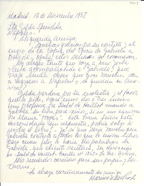 [Carta] 1952 dic. 16, Madrid, [España] [a] Gilda Péndola, Nápoles [manuscrito] Marina Núñez del Prado.