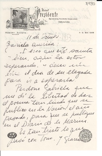 [Carta] 1953 oct. 11, [Cuba] [a] Gabriela Mistral [manuscrito] Marina [Núñez del Prado].