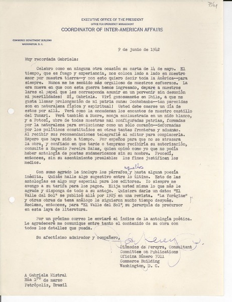 [Carta] 1942 jun. 9, [Washington D.C., EE.UU.] [a] Gabriela Mistral, Petrópolis, Brasil [manuscrito] Diómedes de Pereyra.