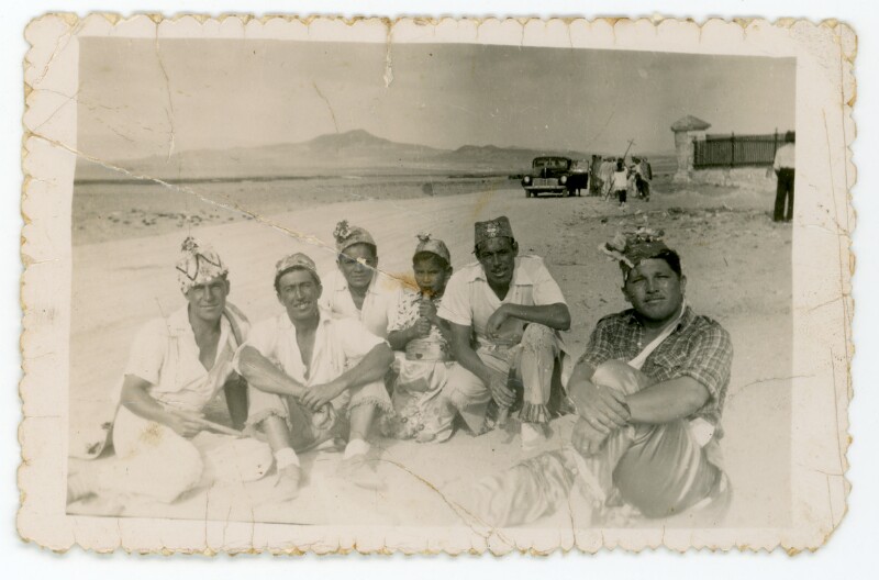 [Grupo de hombres en la playa vestidos para una celebración religiosa] [Fotografía].