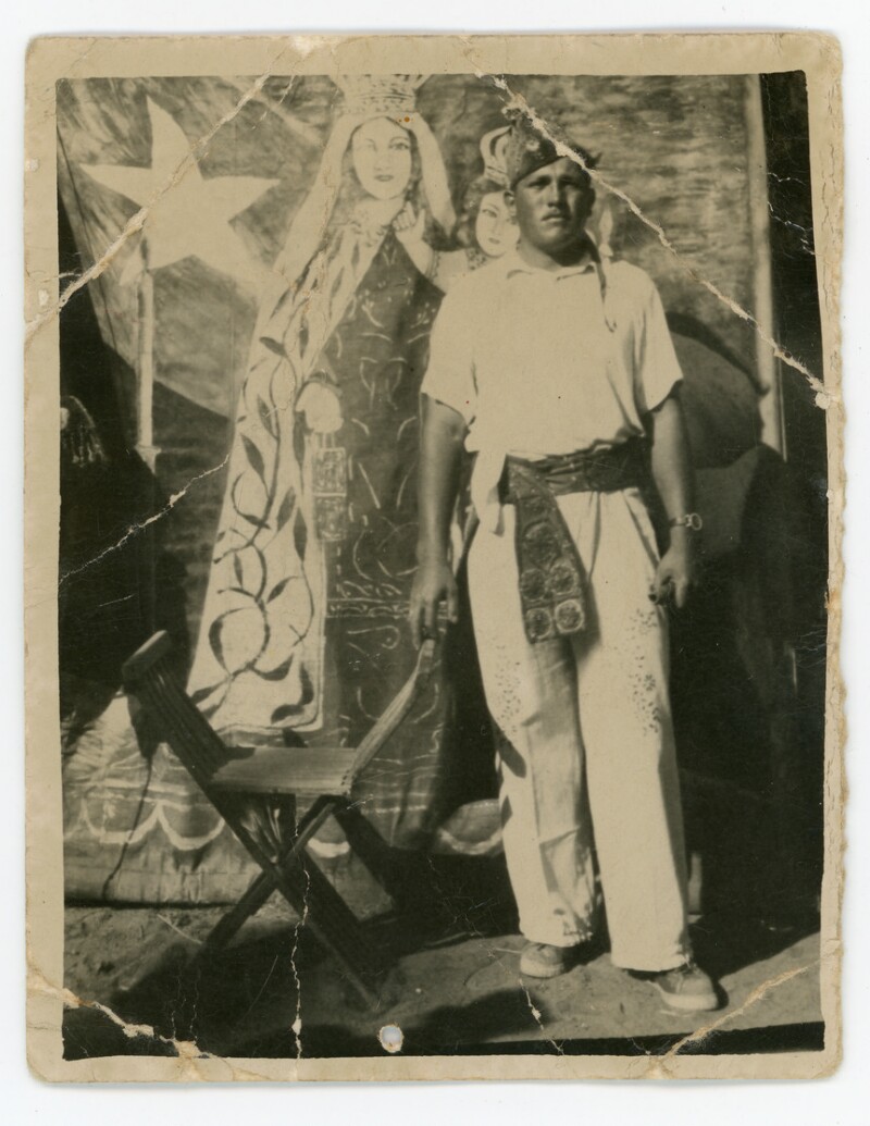 [Hombre con vestuario religioso posando delante de telón de la Virgen de la Candelaria] [Fotografía].