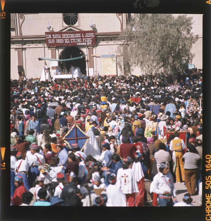 [Procesión de Nuestra Señora del Carmen de La Tirana; peregrinos y cofradías; pórtico del Santuario] [fotografía] Jack Ceitelis.