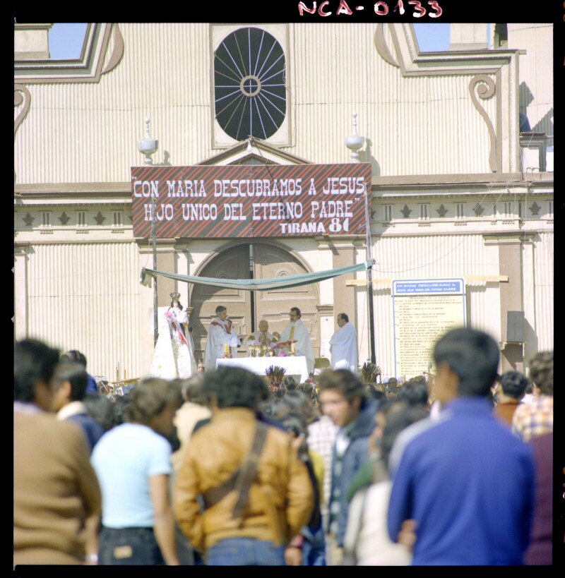 [Festividad de Nuestra Señora del Carmen de La Tirana; fieles y peregrinos asisten a la eucarístia, realizada por cuatro sacerdotes; pórtico del Santuario] [fotografía] Jack Ceitelis.