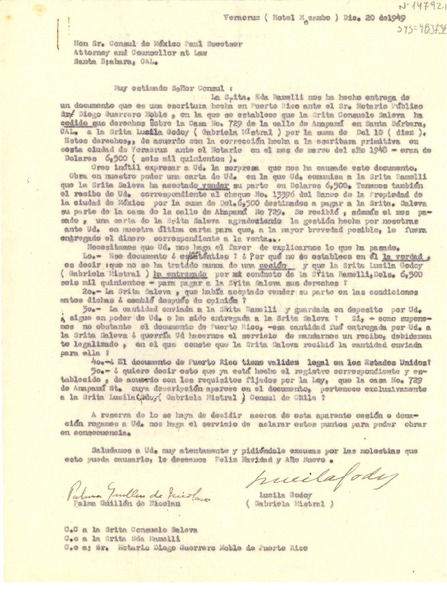 [Carta] 1949, dic. 20, Hotel Mocambo, Veracruz, [México] [a] Paul G. Sweetser, Santa Barbara, Cal. [Estados Unidos] [manuscrito] Palma Guillén de Nicolau, Luclila Godoy (Gabriela Mistral).