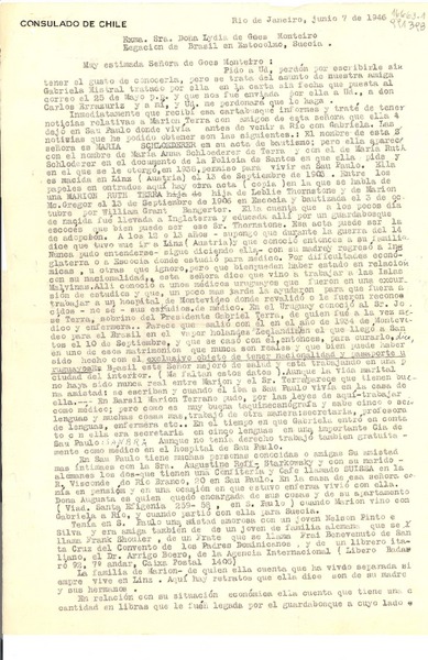 [Carta] 1946 jun. 7, Rio de Janeiro, Brasil [a la] Exma. Sra. Doña Lydia de Goes Monteiro, Legación de Brasil en Estocolmo, Suecia [manuscrito] Palma Guillén.