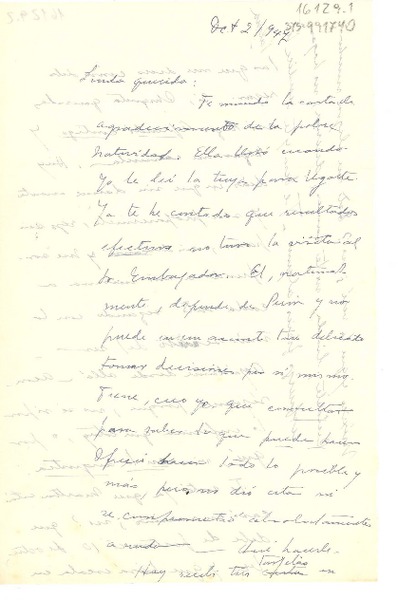 [Carta] 1947 oct. 2, [a] [Gabriela Mistral] [manuscrito] Palma [Guillén].