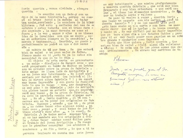 [Carta], 1961 sep. 10, México [a] Doris Dana, [New York] [manuscrito] Palma Guillén de Nicolau.